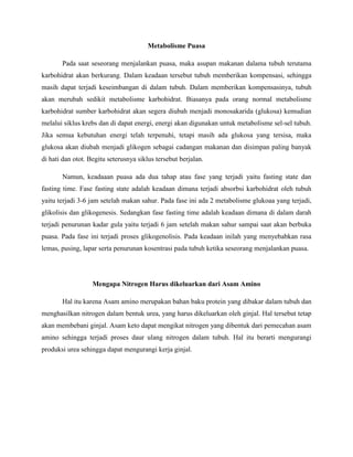 Metabolisme merupakan keseluruhan dari reaksi kimia yang dilakukan oleh organism hidup. Energi ini diperlukan untuk mengikat berbagai senyawa untuk membuat senyawa kompleks. Puasa yang terus menurus dalam waktu yang lama akan menggunakan cadangan karbohidrat menjadi energi dan tubuh mulai mencari.